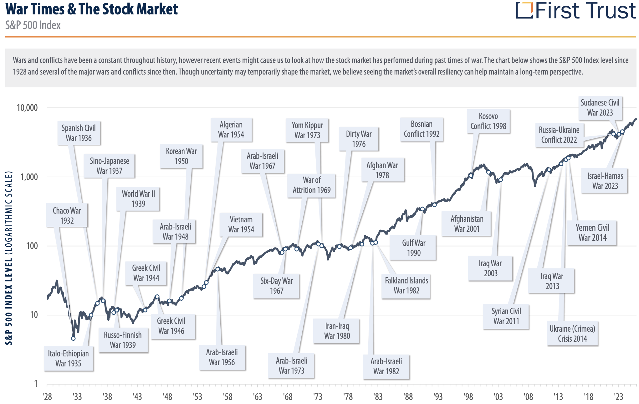 The chart above plots the S&P 500 on a logarithmic scale from 1928 through 2023, annotated with every major war and conflict along the way. World War II, Korea, Vietnam, the Gulf War, Afghanistan, Iraq, and the recent conflicts in Ukraine and Israel. Through all of them, the long term trajectory of the market has been overwhelmingly upward.